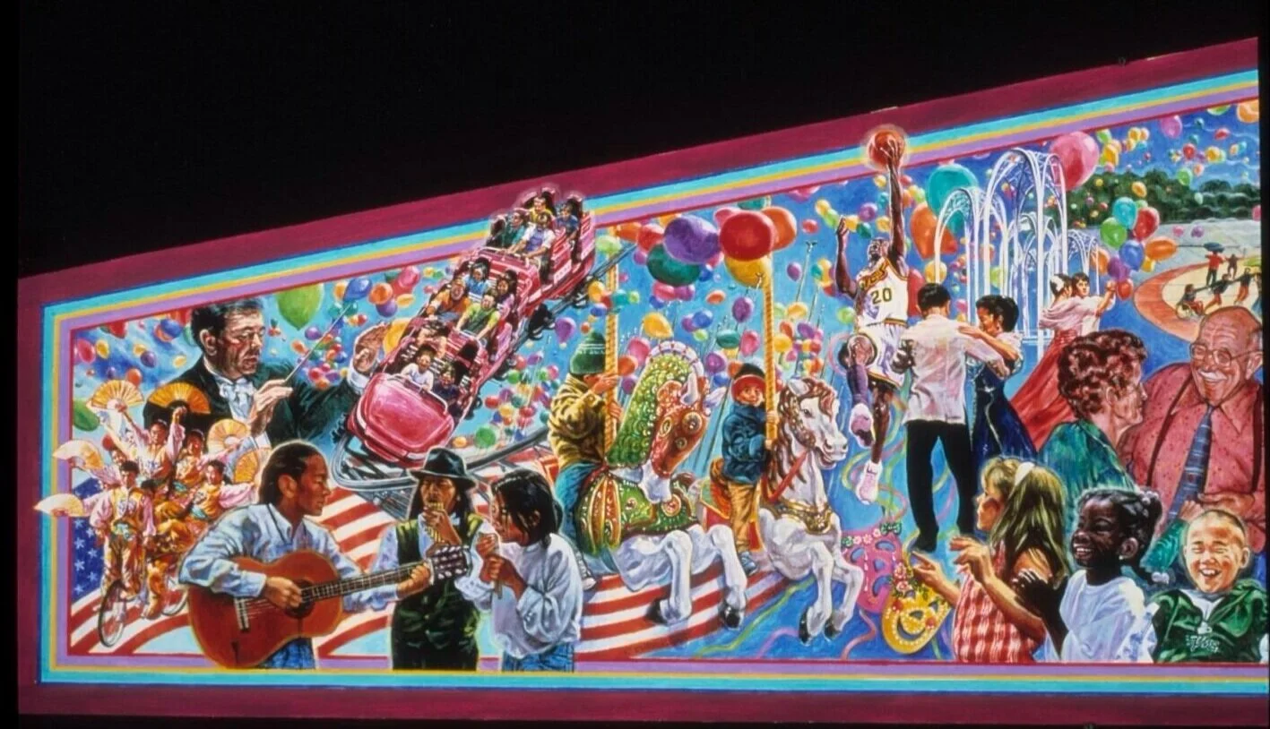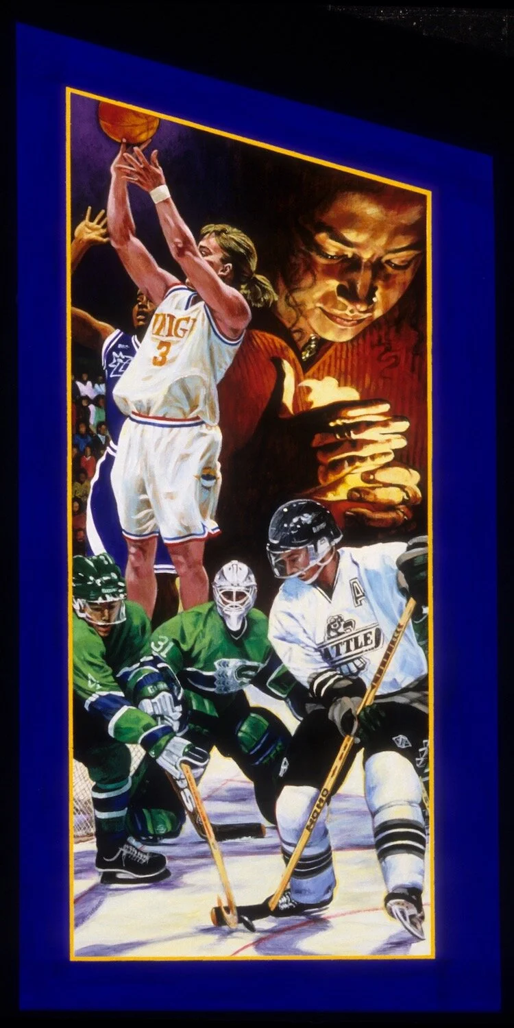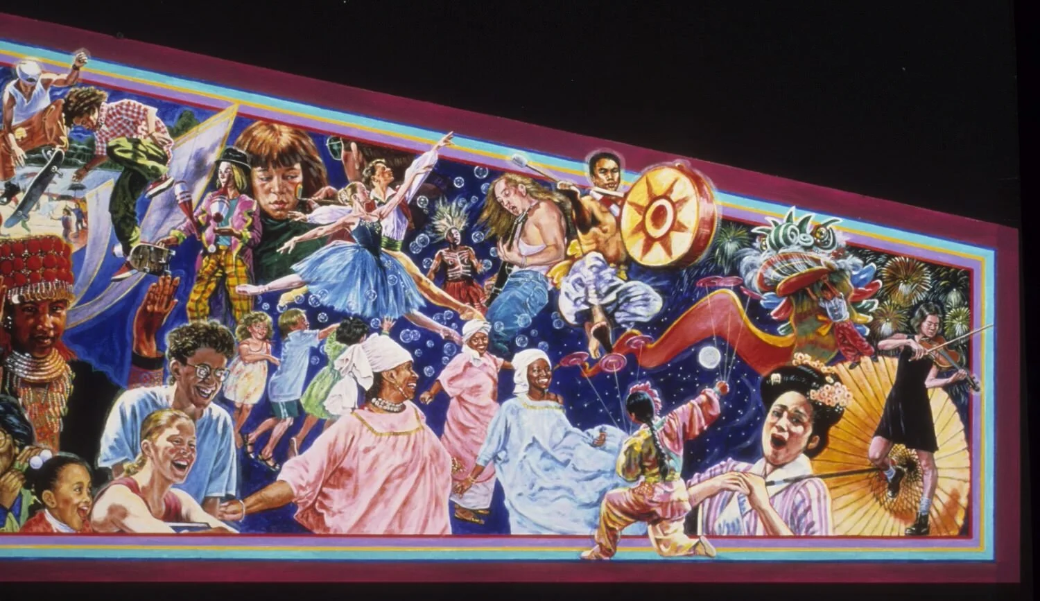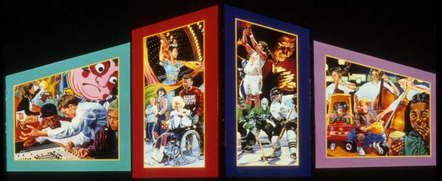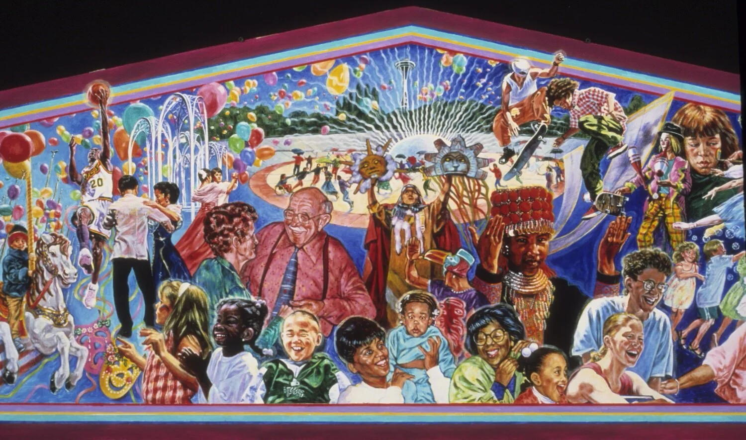 Original acrylic paintings on plywood; final murals digitally enlarged, printer's ink on vinyl, steel frame. Original painting digitally enlarged with 4-color printing process on vinyl by Ackerley Communications. Two site specific murals done for the Main Floor area of the Seattle Center House. The murals bring together all of the arts, activities, and entertainments offered at the Seattle Center including many of the ethnic festivals which take place here annually.