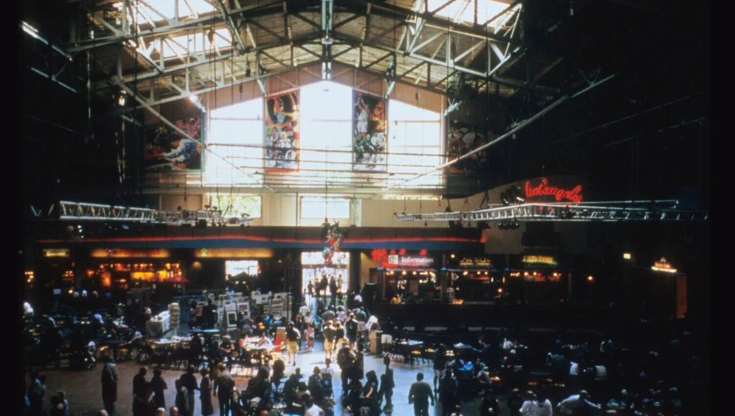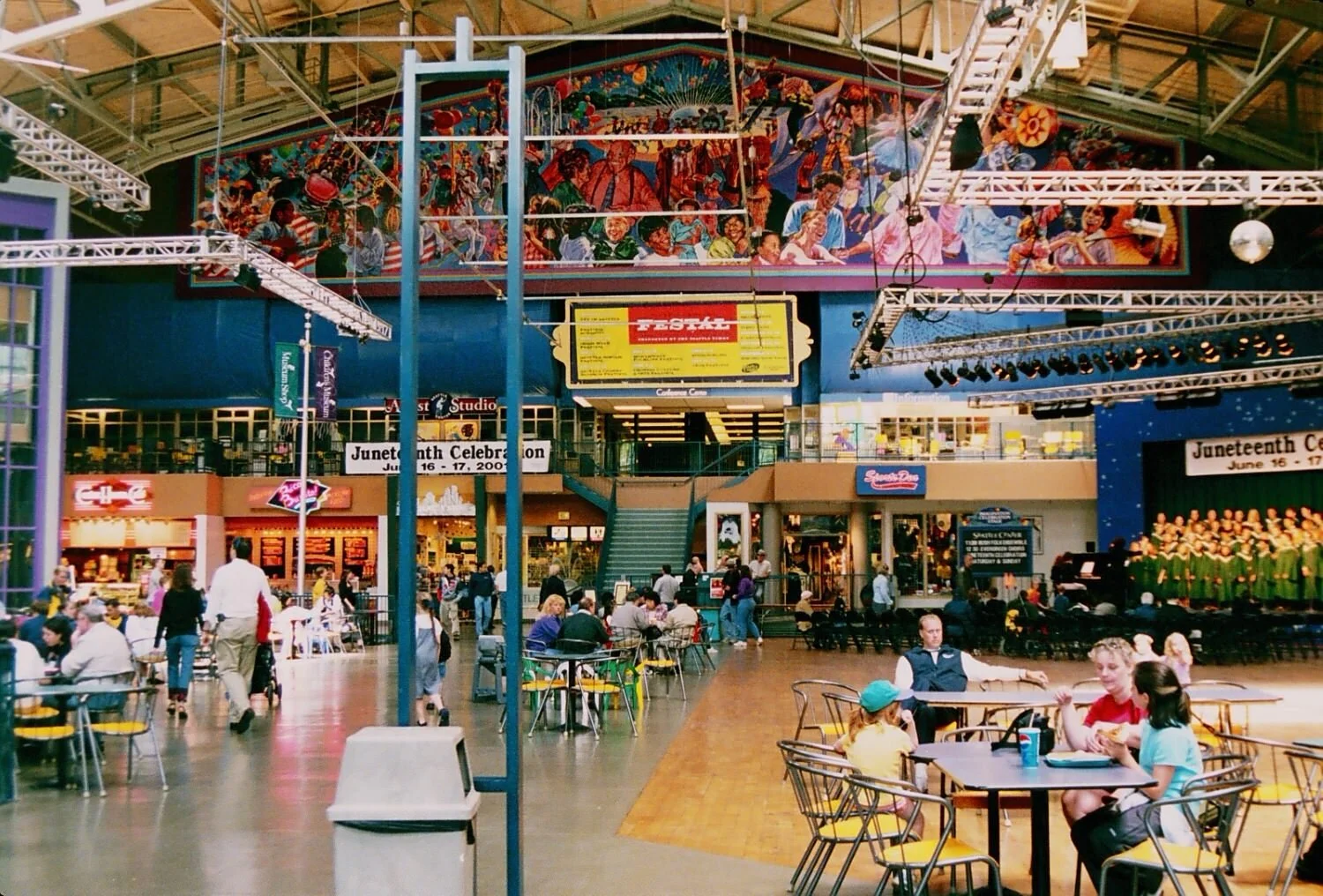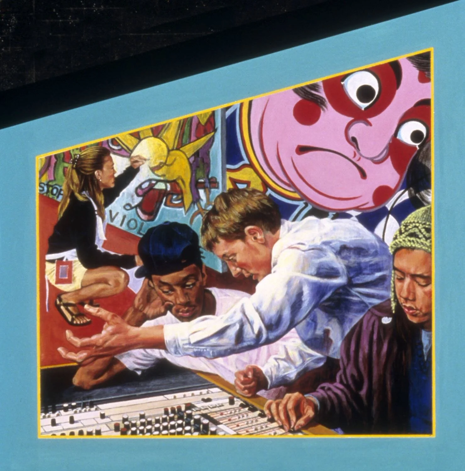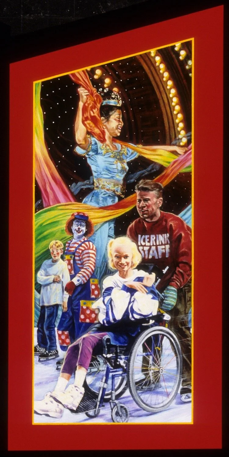 Original acrylic paintings on plywood; final murals digitally enlarged, printer's ink on vinyl, steel frame. Original painting digitally enlarged with 4-color printing process on vinyl by Ackerley Communications. Two site specific murals done for the Main Floor area of the Seattle Center House. The murals bring together all of the arts, activities, and entertainments offered at the Seattle Center including many of the ethnic festivals which take place here annually.